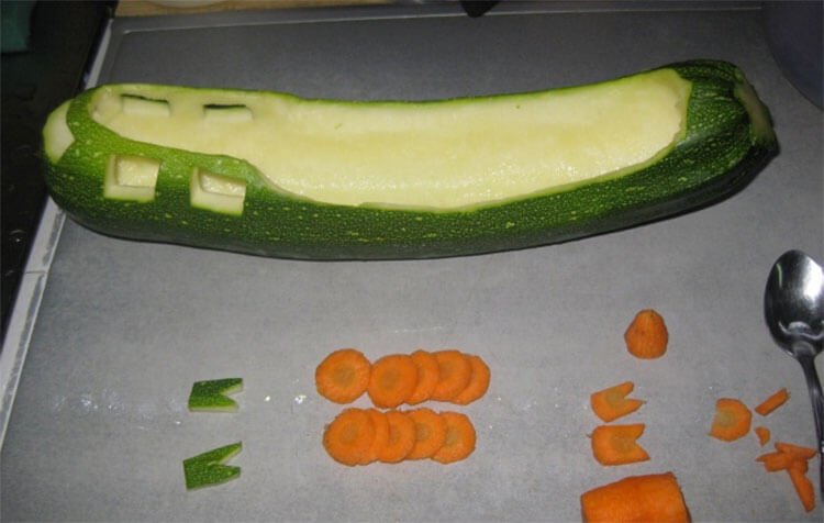 Начинать лучше с более широкой части кабачка и двигаться по направлению к «носу» овоща. Но дорезать до конца не нужно – оставьте несколько сантиметров в запасе. Как вы сами понимаете, данную процедуру лучше доверить взрослому человеку, чтобы малыш не порезался. Тем более что ребенок тем временем может заняться изготовлением аксессуаров к кораблю, а также созданием экипажа. Но об этом чуть позже.