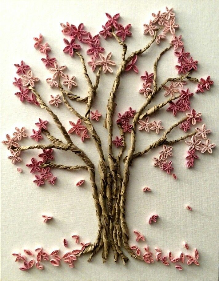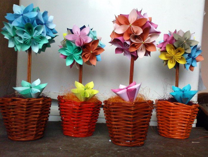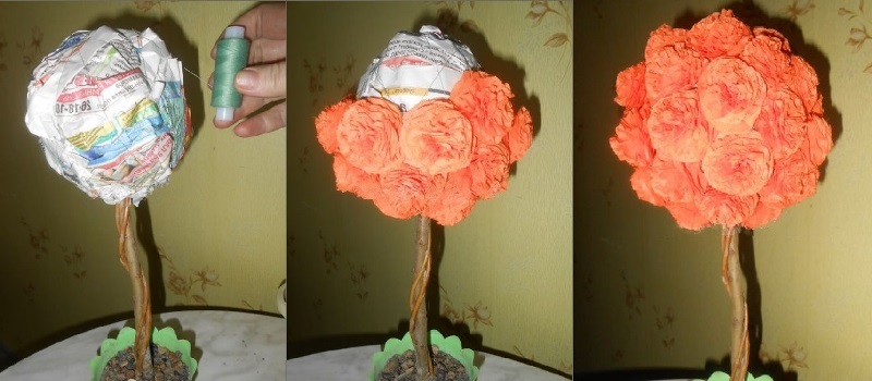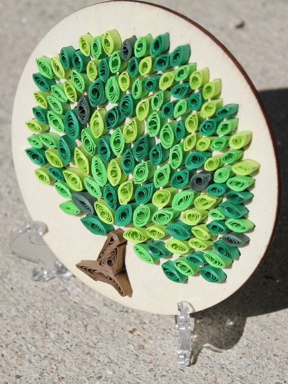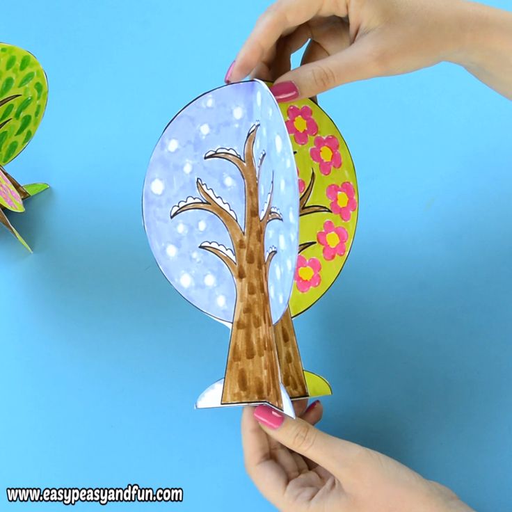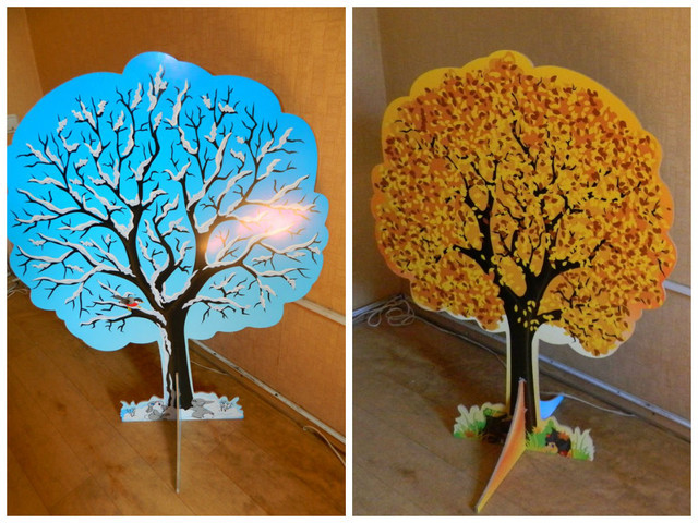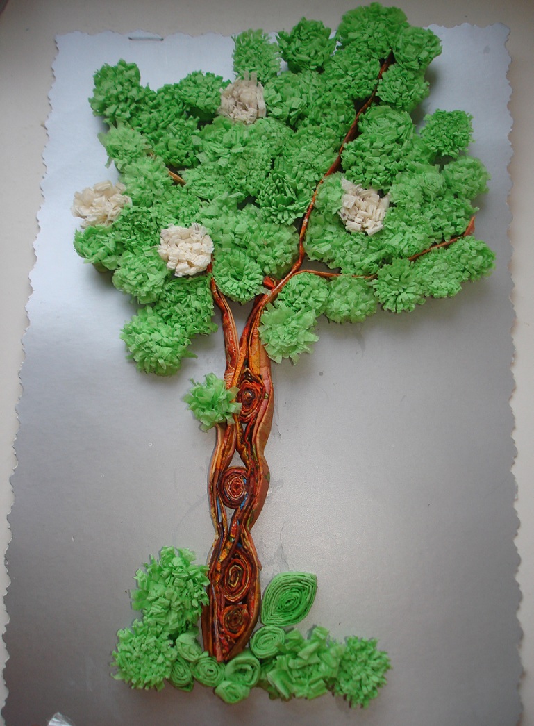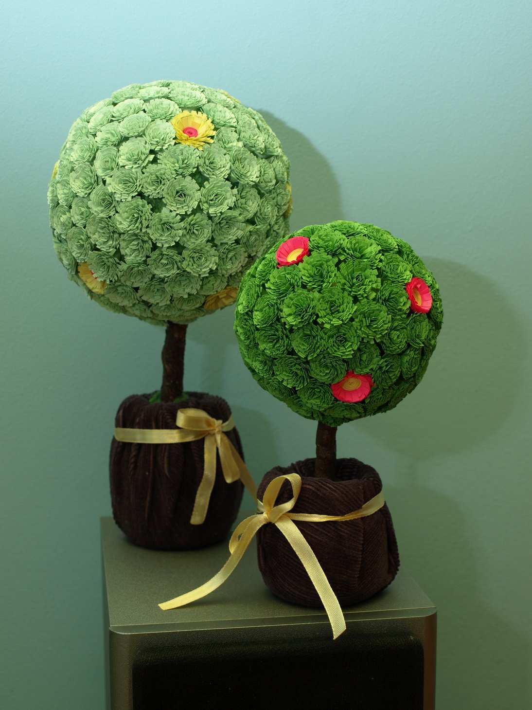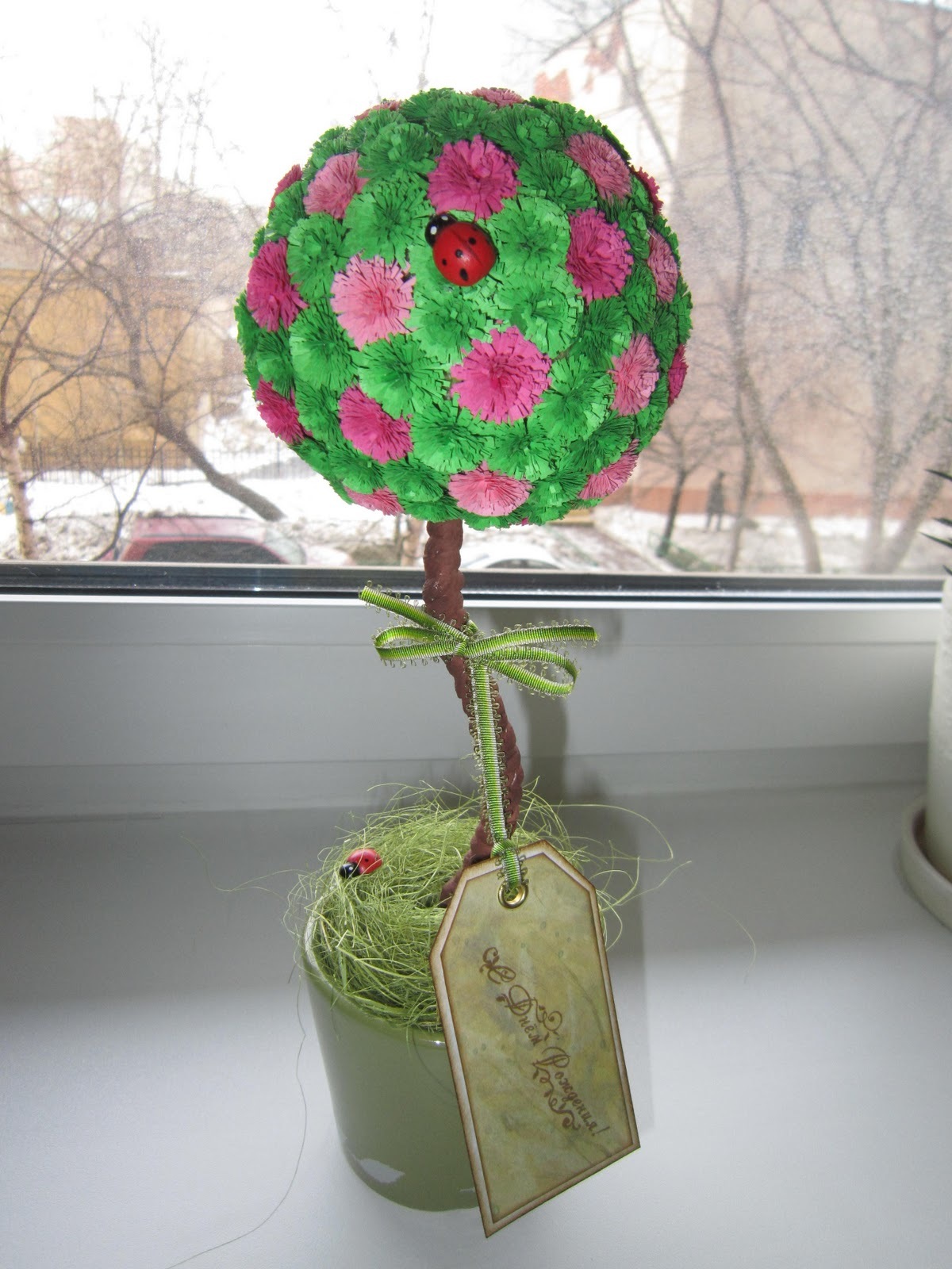 Вот и вся работа. Поделка в виде объемного бумажного дерева готова. Теперь нужно придумать название своему дереву. Даже такое простое творчество допускает эксперименты. Вы можете показать разные сезоны на одном дереве, выделяя сегменты колечек белого (голубого), оранжевого (желтого), розового цвета, или придумать свой уникальный вариант.