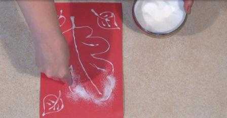 Затем аккуратно наклоняем и трясем картонку — лишняя соль ссыпается с картины, и остаются пушистые снежные рисунки из соли на базе клея.