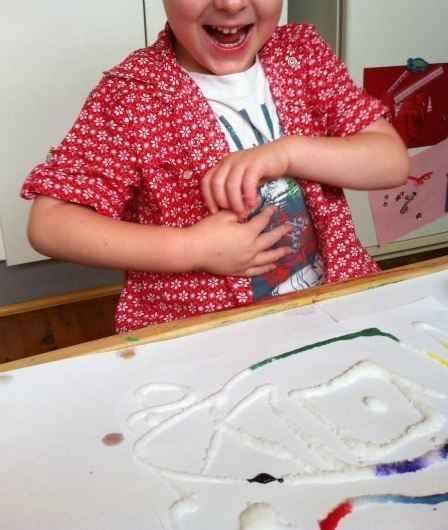 На всякий случай предупрежу, что готовый результат получается довольно хрупким. Лист с картиной лучше не мять, чтобы не повредить “творение” малыша.