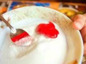 В небольшие глубокие тарелочки насыпать примерно по горсти соли. Далее растворить в столовой ложке воды пищевой краситель и добавить его в тарелочку с солью. И все тщательно перемешать.