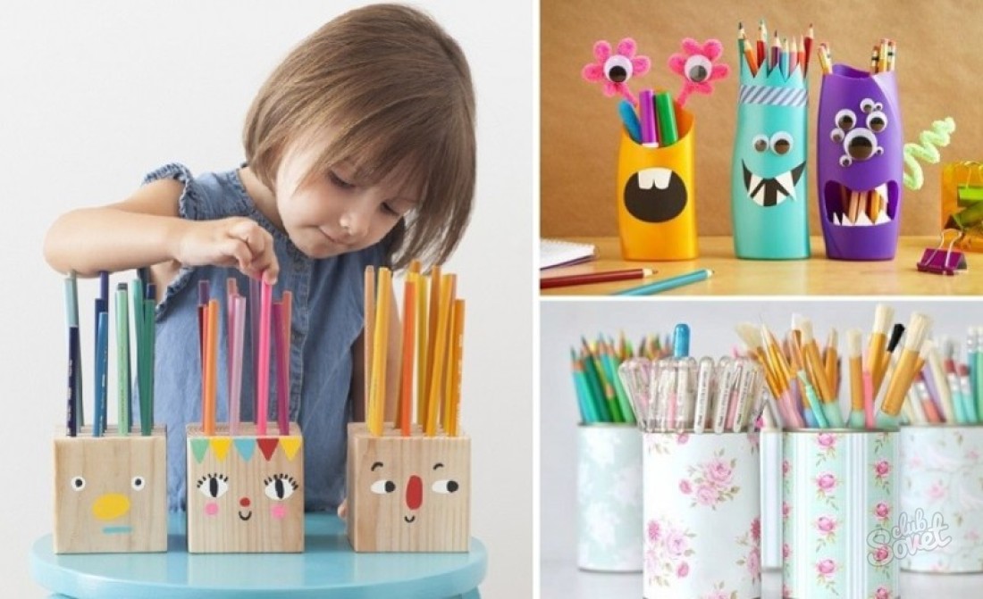 Основные инструменты – ножницы, скотч, клей, степлер, а дополнительными являются разные материалы, которые имеются в доме. Если ребенку понравится какая-нибудь идея, и он с помощью взрослого сделает своими руками, к примеру, подставку для ручек, дальше он сам будет проявлять свою фантазию, развивая творческие способности, выдвигая разные креативные идеи, будь это простые поделки из шишек и пластилина или полезные в доме вещи.