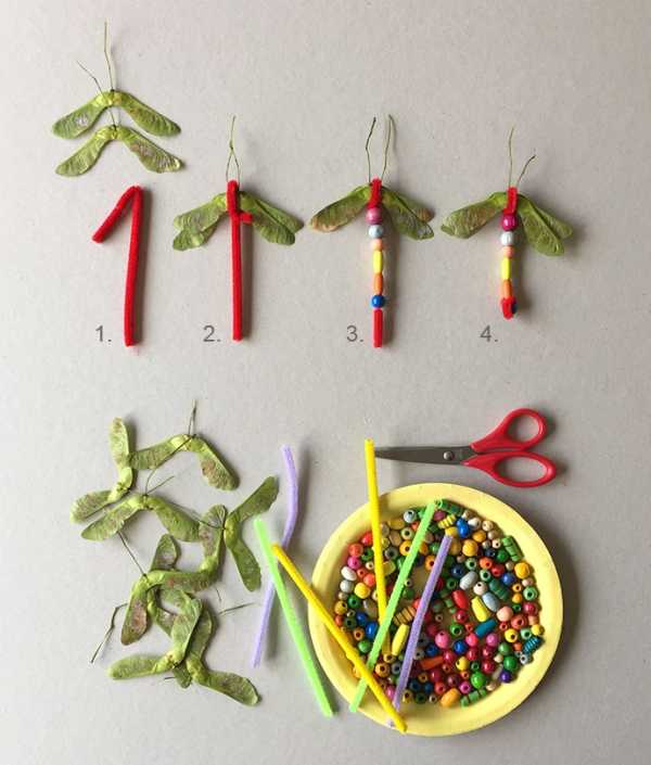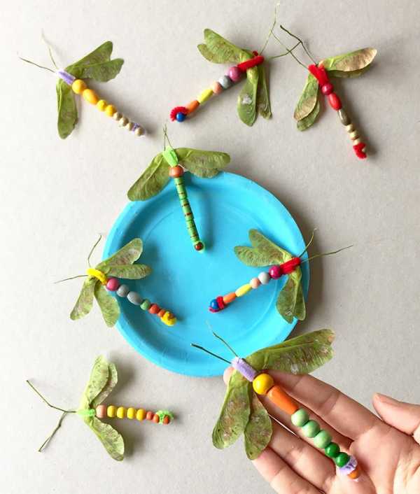 Будет лучше, если первой бусиной станет самая большая бусина, так она будет похожа на голову. С семян клена не обрывайте черенки, они станут естественными усиками стрекозы.