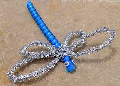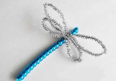 Ближе к концу оставляем между бусинами промежуток, словно отделяя голову стрекозы от ее туловища. Кончик снова хорошо распушаем. Поделка стрекоза своими руками почти сделана, осталось только изготовить ее летательный аппарат.
