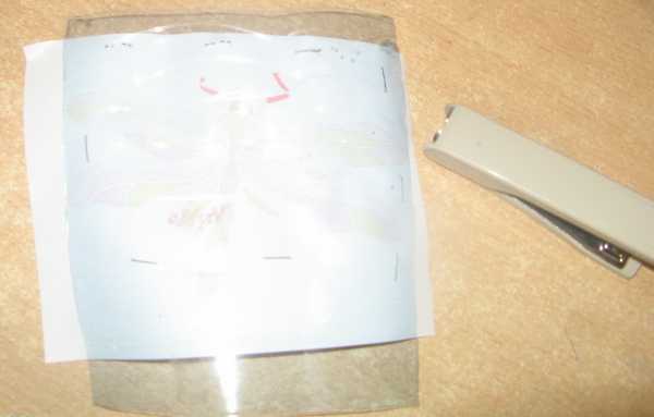 Шаблон, на котором будут собираться витражные крылья, защищаем от попадания влаги прозрачным скотчем.