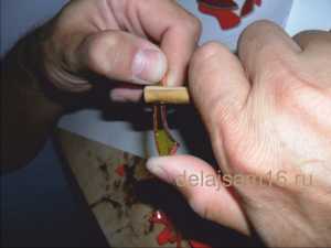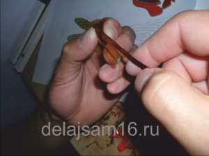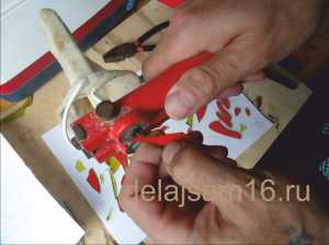 Сбоку раскаленным шилом сделала отверстия для лапок. Вставила проволоку.