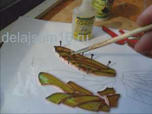 Теперь приступаем к сборке витражных крыльев. Отделяем от подложки, нарезанную плёнку, затем приклеиваем на стекло.