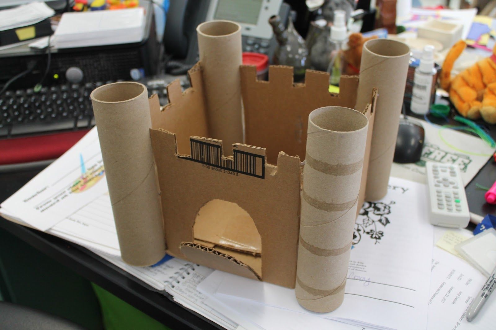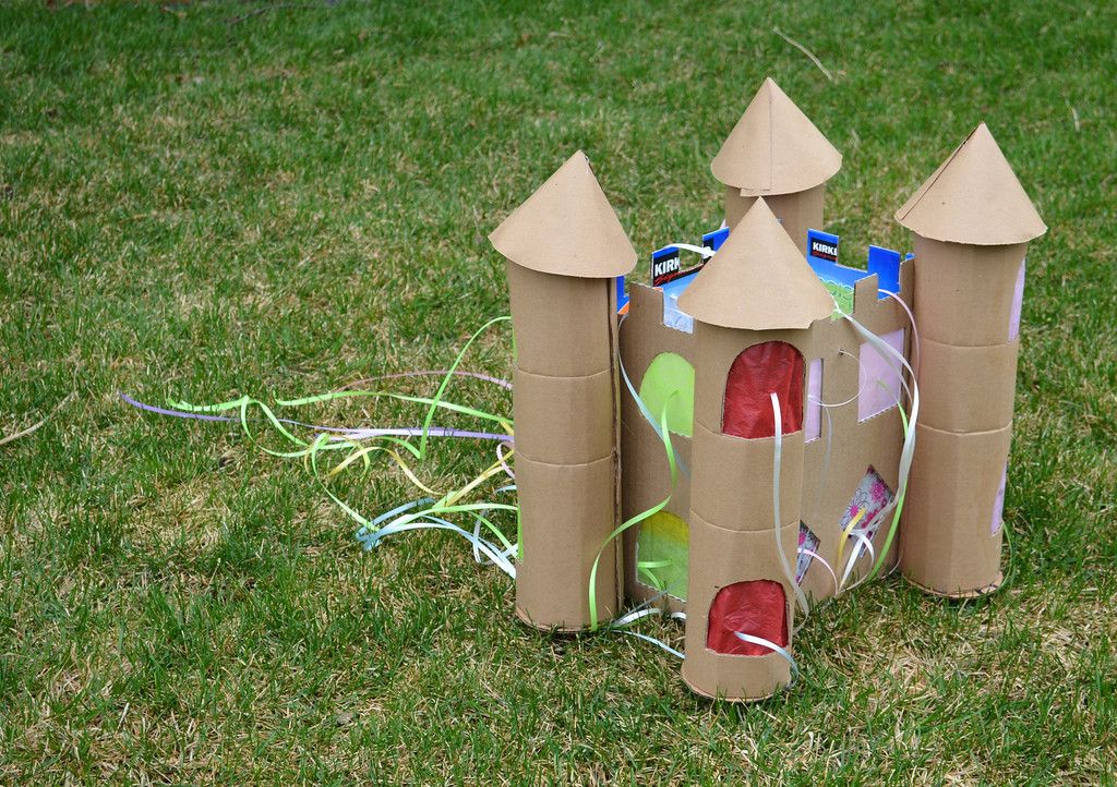 Посмотрите, какой замечательный замок получился из тех самых картонных цилиндров и туалетной бумаги. На картонное основание крепятся цилиндры-вкладыши, которые затем дополняются крышами в виде конусов, вырезанных из картона. У некоторых башенок верх просто вырезается зубчиками. Состыковать башни с крепостной стеной, также вырезанной из картона, можно с помощью прорезей, сделанных в цилиндрах макетным ножом. Создать фактурную поверхность башенок можно с помощью туалетной бумаги, смоченной клеем ПВА. Двери и окна также вырезаются макетным ножом. Собранной конструкции дают хорошенько просохнуть и раскрашивают акриловыми красками. Мальчишки с удовольствием разместят в такой крепости рыцарей и будут разыгрывать баталии. А ваша маленькая принцесса будет очень рада обзавестись жилищем для своих кукол.