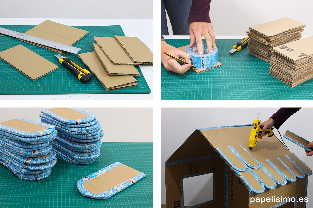 Сделать его не так уж сложно из нескольких коробок. Соединяют коробки между собой с помощью степлера, строительного скотча или клея. Окна и двери вырезают макетным ножом и декорируют.
