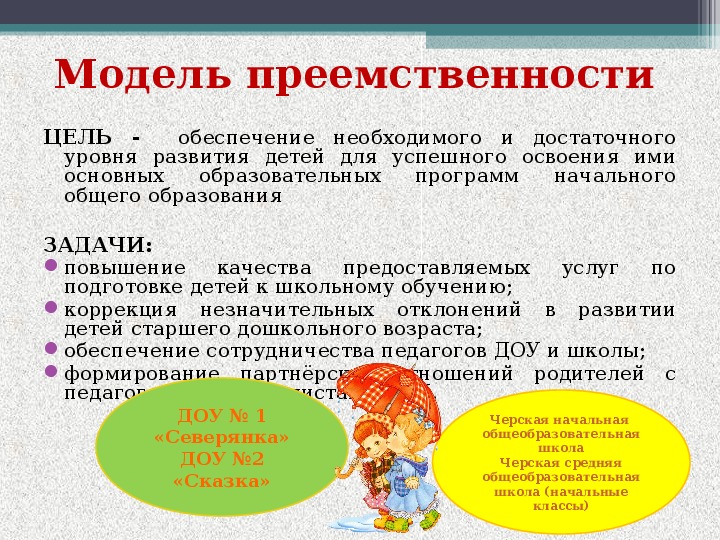 Преемственность в системе образования — это установление взаимосвязи между смежными ее звеньями в целях последовательного решения задач обучения и воспитания.
