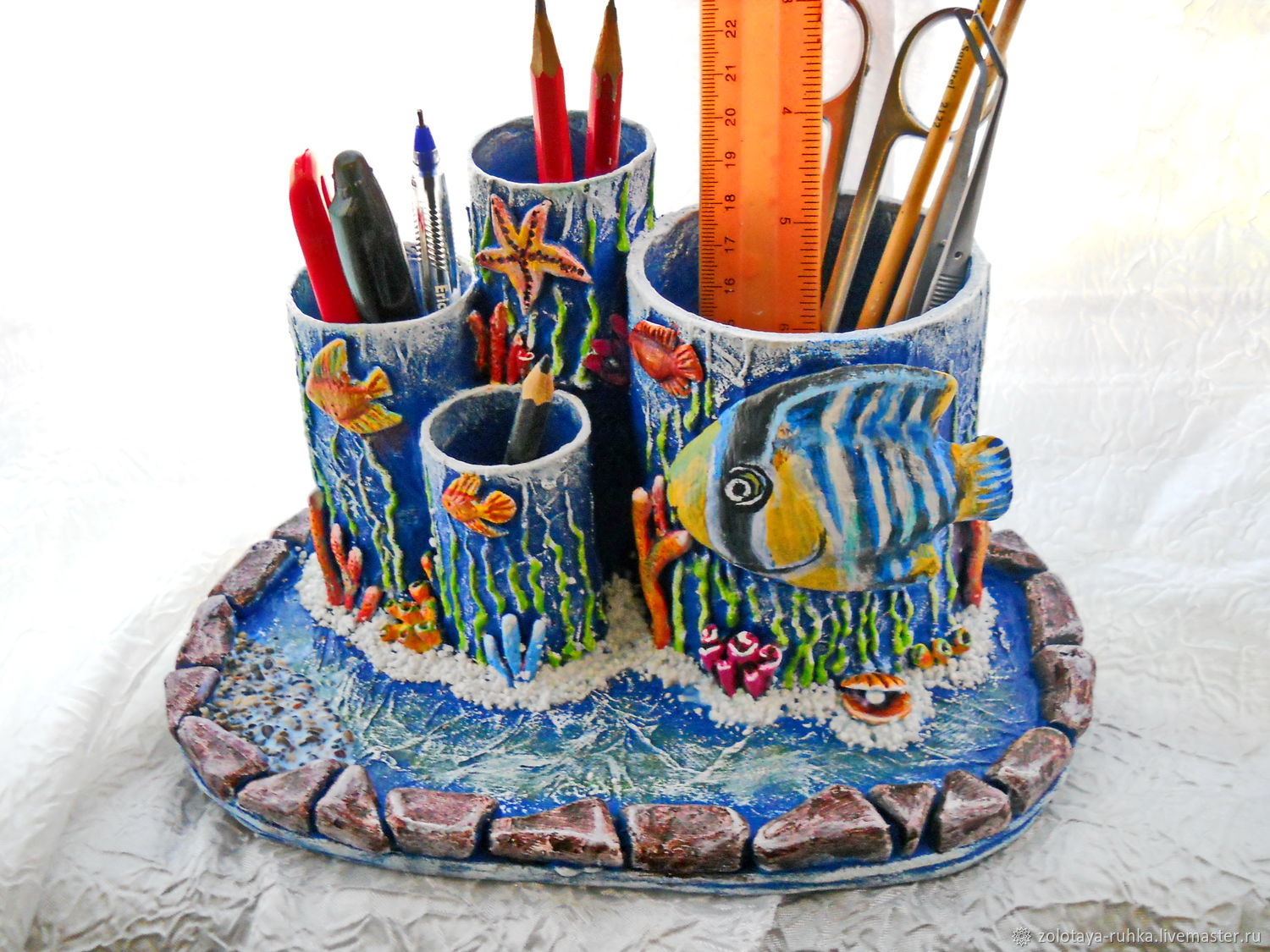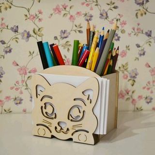 Их можно сделать из спила, брусочка, бревна, фанеры, палочек от мороженого, веточек и т. д. Материал для декорирования также разнообразный. Например, краска или наклейки для декупажа и более необычные варианты вроде шерстяных носков. Подставки из дерева получаются красивыми, устойчивыми, долговечными. Они красиво смотрятся не только на письменном столе ребенка, но украсят собой даже рабочий стол взрослого человека.