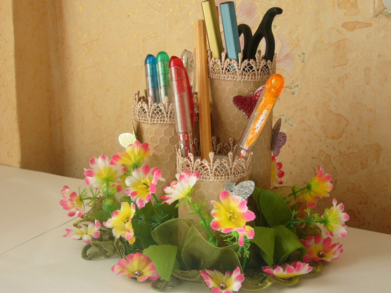 Чтобы карандашница исполняла не только свою главную функциональную роль, но и красиво смотрелась, вписывалась в интерьер, поднимала настроение, её можно украсить.