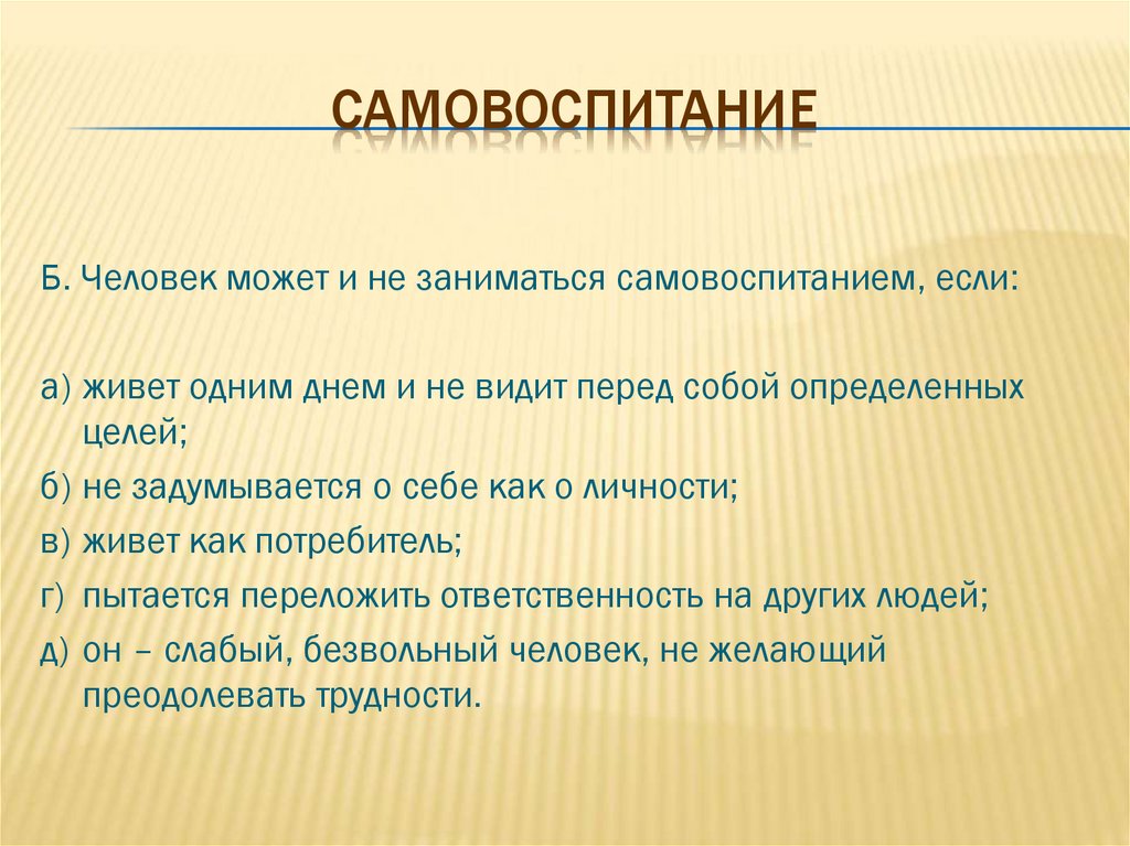 Воспитатель должен себя так вести, что6ы каждое движение его воспитывало, и всегда должен знать чего он хочет в данный момент и чего он не хочет. Если воспитатель не знает этого, кого он может воспитывать?