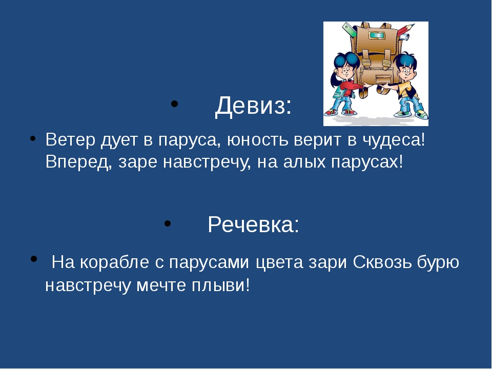 Каждый класс готовит название, девиз, эмблему. Каждый класс должен рассказать о себе при помощи танцев, музыки, песен, стихов и др. время представления 3-5 мин.