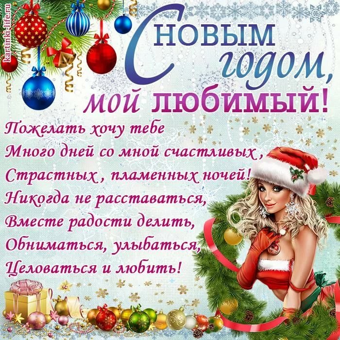 Поздравительная открытка с Новым годом, пара поцелуев и объятий – пожелания для вашей возлюбленной!