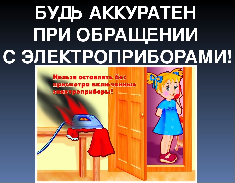 Для чего нужно знать правила пользования электроприборами? Электроприборы – наши верные друзья и помощники. Хоть они и не живые, но обращаться с ними нужно бережно и осторожно. Электрический ток, без которого не заработает ни один прибор, может быть очень опасен. Чтобы не пострадать из-за неправильного обращения с электричеством, познакомьте детей с основными правилами пользования электроприборами, которые должен знать каждый. Правило первое: Не засовывайте в розетку посторонние предметы! Розетка предназначена для включения в сеть электроприборов , а вовсе не для пальцев и других посторонних предметов, особенно металлических. Эти предметы – хорошие проводники электрического тока! Правило второе: Не касайтесь руками оголенных проводов! Если задеть оголенный провод включенного прибора, можно получить удар током. Правило третье: Не трогайте включенные приборы мокрыми руками! Вода является проводником электрического тока. Запомните: Перед тем, как включать, выключать или еще что-либо делать с электроприборами, руки надо вытереть насухо! Правило четвертое: Нельзя протирать включенные приборы влажной тряпкой! Если вам захочется, например, протереть телевизор, то сначала выключите прибор, а потом уже вытирайте с него пыль. Правило пятое : Нельзя пользоваться электроприборами, касаясь воды! Как вы знаете, вода – отличный проводник электрического тока, поэтому никогда не касайтесь одновременно воды и включенного электроприбора! Правило шестое: Не оставляйте включенные электро-приборы без присмотра! Уходя из дома, всегда проверяйте, потушен ли свет, выключен ли телевизор, магнитофон, утюг и другие электроприборы. Правило седьмое: Не засыпайте при включенных телевизоре, магнитофоне, обогревателе и других бытовых электроприборах! Правило восьмое: Не включайте в одну розетку больше трех электроприборов! Правило девятое: Не обертывайте электролампы горючими материалами (тканью, бумагой)! Как вести себя при возгорании электроприборов? Надеемся, что все приборы в вашем доме в полной исправности и никогда не загорятся. Но, к сожалению, в силу разных причин электроприборы могут воспламеняться и стать причиной пожара. Ни в коем случае нельзя тушить прибор водой, пока он включен в сеть! Сначала нужно отключить прибор, а только потом заливать водой. Если поблизости нет воды, можно накрыть прибор одеялом, засыпать песком, землей. Если вы видите, что не справляетесь с огнем, нужно вызвать пожарных. Как помочь ребенку, пострадавшему от удара током? Как это ни печально, наши дети не всегда слушают нас и порой поступают по-своему. Чтобы ребенок не пострадал от электричества, необходимо заранее принять меры: все розетки снабдить специальными заглушками, спрятать все электропровода, чтобы ребенок не смог до них добраться. 1.Если ребенок все же засунул в розетку палец или предмет и его бьет током, необходимо оттолкнуть или оттащить малыша за край одежды или ремень. Для безопасности необходимо встать на сухую доску, резиновый коврик, стопку книг или газет. Свою руку нужно обернуть сухой тканью или надеть резиновую перчатку. 2.Если ребенок схватился за оголенный провод, нужно немедленно отключить прибор от сети. Если это сделать невозможно, то следует перерубить провод топором с деревянной ручкой или перекусить изолированными кусачками. 3.После 