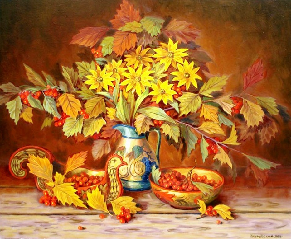 Художник Иван Трофимович Хруцкий «Цветы и плоды». Название удивительно точно передает содержание полотна. Изображен яркий букет цветов в вазе, под которым располагаются многочисленные плоды. Композиция передает атмосферу и настроение позднего лета и ранней осени.