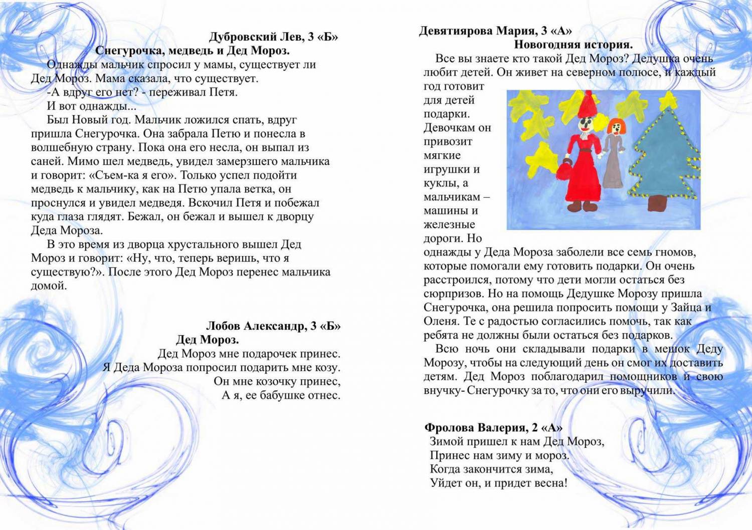 И тут шорох. «Кто-то идет, надо быстрей куда-то спрятаться», – сказал Гномик и залез под елку, думая, что его никто не увидит, вдруг он видит, что с лестницы спускается маленький мальчик. Гном очень испугался, он подумал, что мальчик может рассказать все это родителям. Мальчик спускался посмотреть свои подарки под елкой. Ребенок заглянул под елку, но не нашел подарков, а увидел Гнома в шапочке и с белой бородой. Они друг друга испугались. Мальчик побежал к себе в постель, но гном его остановил и сказал: