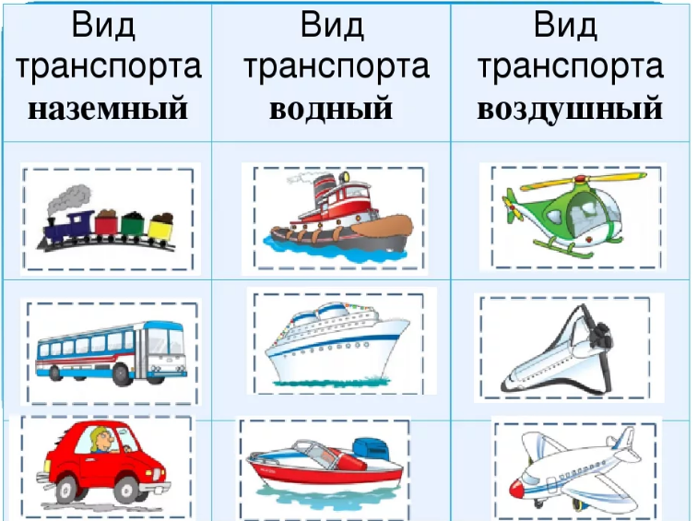 Для передвижения по земле, воде, воздуху, для перевозки пассажиров и грузов служит транспорт. Транспорт бывает: пассажирский, грузовой, специальный. Пассажирский – перевозит людей: автобус, маршрутное такси, самолет, поезд и т.д. Грузовой – перевозит груз: грузовые машины, грузовые поезда, самолеты, корабли и т.д.