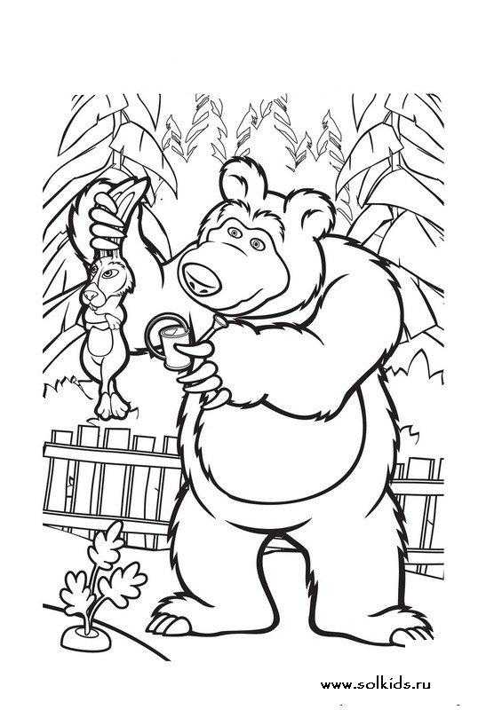 Раскраски Маша и медведь показывают все любимые занятия добряка. Это рыбалка, футбол и ухоженный огород.