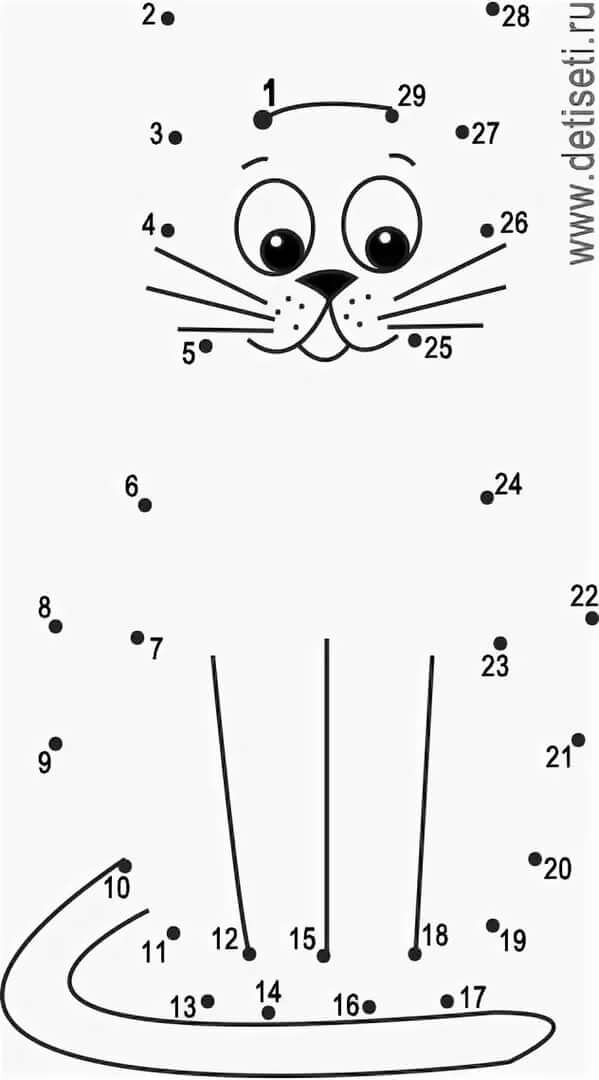 Математическая раскраска с симпатичной кошечкой – здесь нужно соединить точки от 1 до 18, а потом можно ее раскрасить.