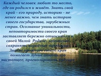 Иногда хочется пройтись тихим шагом, вглядываясь в каждый бугорок, в каждую травинку, в каждую березку. Много пережила наша земля весенних ливней, которыми поила посеянное зерно, зимних метелей, которые укрывали белыми снегами поля и леса. Сколько земля пережила вместе с человеком радости и сколько боли доставляют ей бездушные люди, творящие недобрые дела! Все может родная земля сделать для человека. Она может накормить хлебом, напоить чистой водой, удивить своей красотой. Вот только защитить она себя не может.