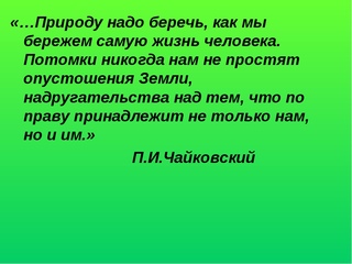 Защита родной земли – это святая обязанность всех. Все мы в ответе за природу перед потомками, перед историей. Человек – часть природы. Иногда он ставит себя сильнее и выше природы. Вправе ли он так делать? Никогда не нужно забывать, что человек – старший по разуму, и он должен заботиться обо всем на свете. Сегодня одной из важных проблем является угроза экологической катастрофы.