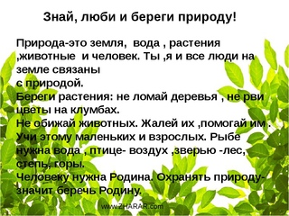 Природа создает все условия для жизни человека, поэтому так важно жить с ней в гармонии. Красивые пейзажи природы наполняют душу человека восторгом, только эта красота по истине завораживает. Интерес человека к природе безграничен; сколько тайн и загадок несут в себе леса, моря. Очень многое мы еще не знаем о природе.