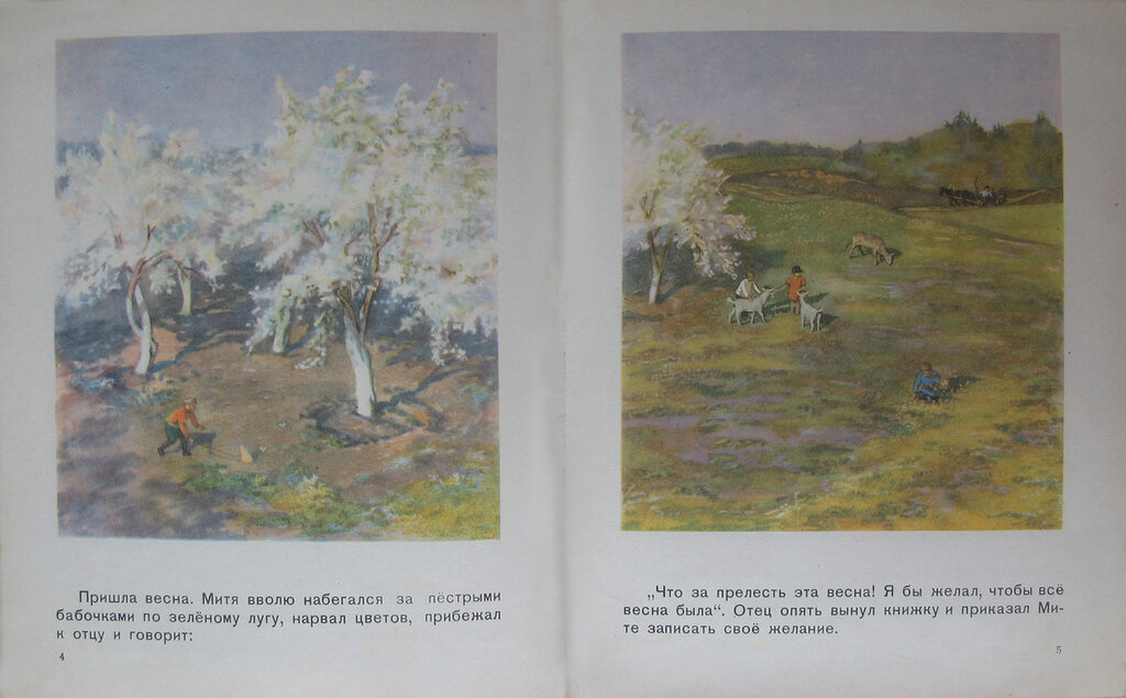 Настала весна и Мите очень понравилось бегать по зеленому лугу, гоняясь за бабочками. Он сообщил отцу о своем желании, чтобы всегда была весна. И это желание было занесено в записную книжку отца.