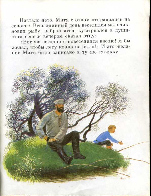 Летом Митя побывал на сенокосе. Он прыгал на душистом сене, ловил рыбу, собирал ягоды. Вечером Митя высказал пожелание, чтобы лето никогда не заканчивалось. Отец записал желание сына к себе в книжку.
