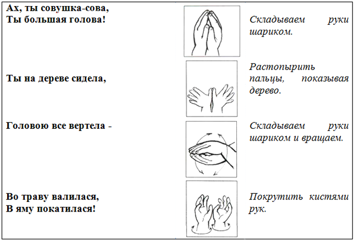 – Где ладошки? Тут? (Спрятать руки за спинную) – Тут! (Протянуть руки вперед ладонями вверх.) – На ладошках пруд? – Пруд! – Палец большой – это гусь молодой.(Поочередно загибать пальцы обеих рук.) Указательный поймал, Средний гуся ощипал, Этот палец печь топил.