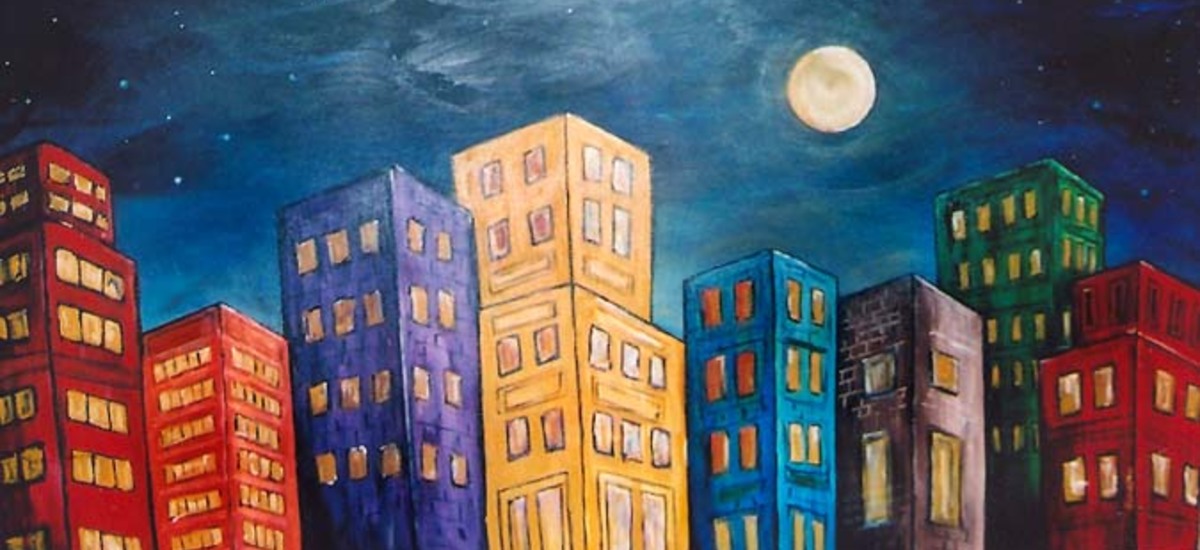 Не забудьте нарисовать ночное небо и ночные улицы темной краской.