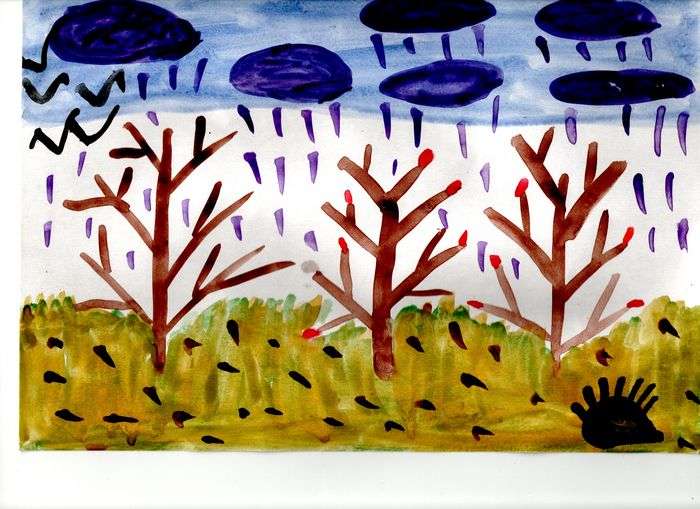 После Физминутка дети рисуют, примакивая всем ворсом кисточки, крону и листопад (листья облетают с деревьев и ложатся на землю) .