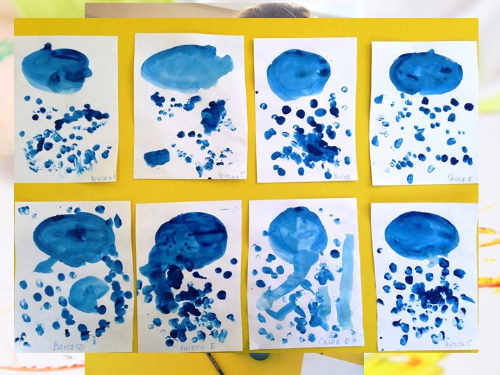 –. Наберем на кисточку желтую краску, поставим на листе яркую