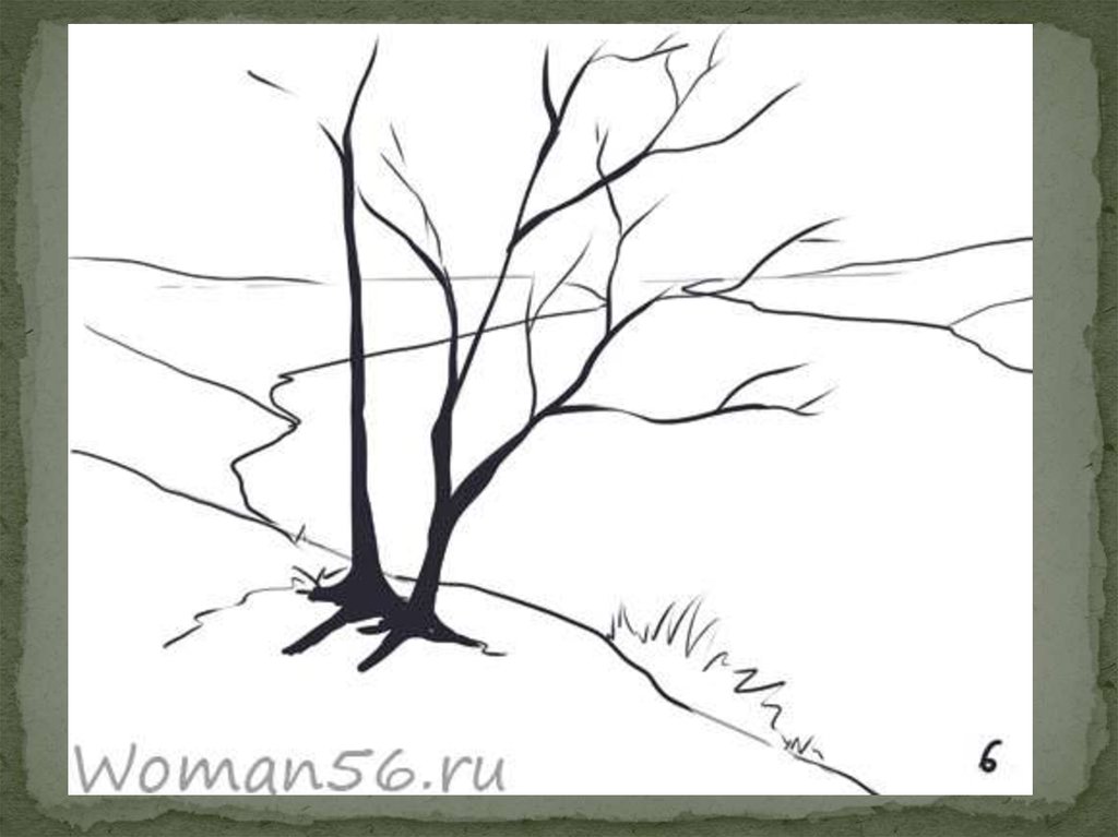 3. На первом плане нарисуем большое дерево с небольшим количеством листвы.
