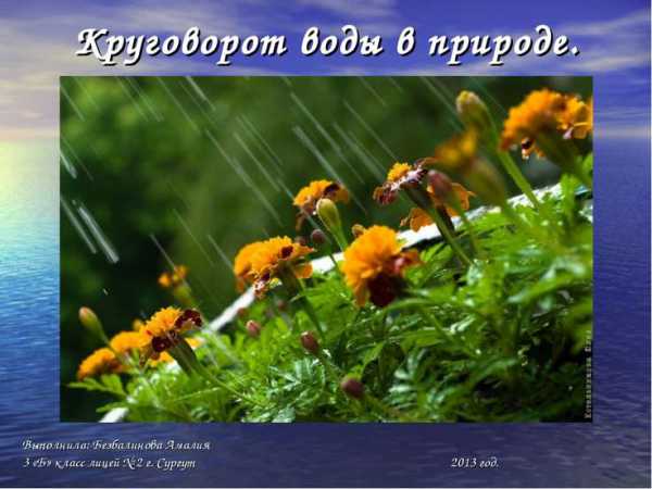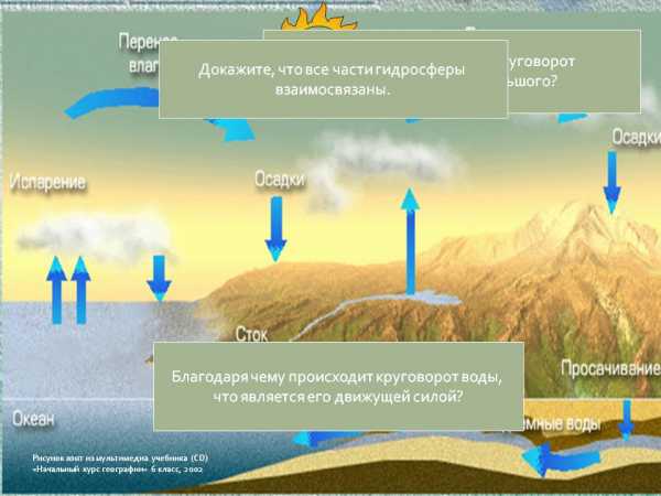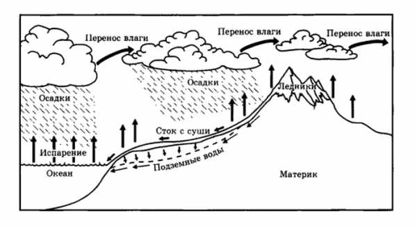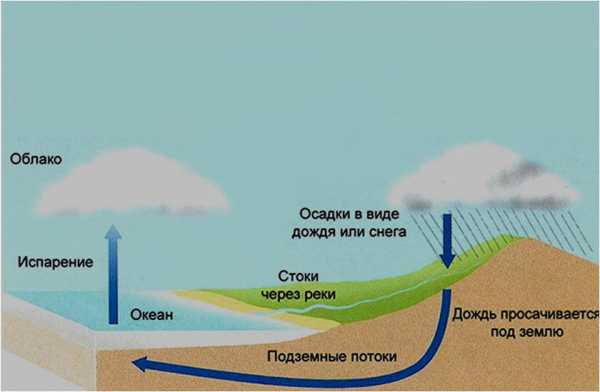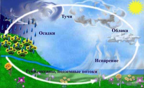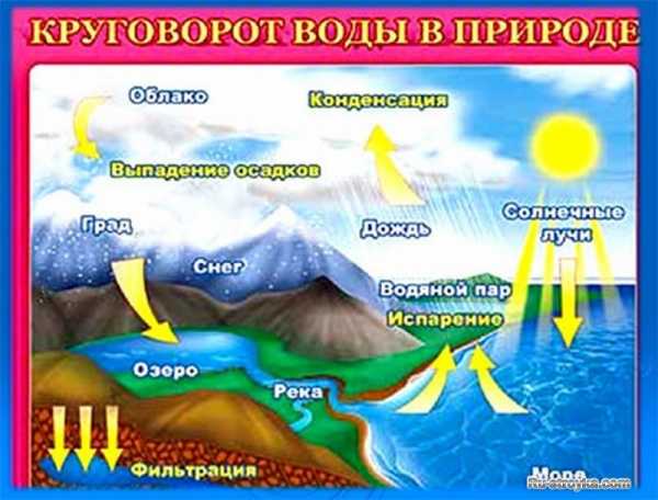 Круговорот воды – это важнейший процесс, происходящий на нашей планете, который обеспечивает жизнь всем живым существам, начиная от мелких животных и растений, заканчивая человеком. Вода необходима для существования всем без исключениям организмам. Она принимает участие во многих химических, физических, биологических процессах. Водой покрыто 70,8% поверхности Земли, и она составляет гидросферу – часть биосферы. Водную оболочку составляют моря и океаны, реки и озера, болота и грунтовые воды, искусственные водоемы, а также вечная мерзлота и ледники, газы и пары, то есть к гидросфере относятся все водные объекты, пребывающие во всех трех состояниях (газообразном, жидком или твердом).
