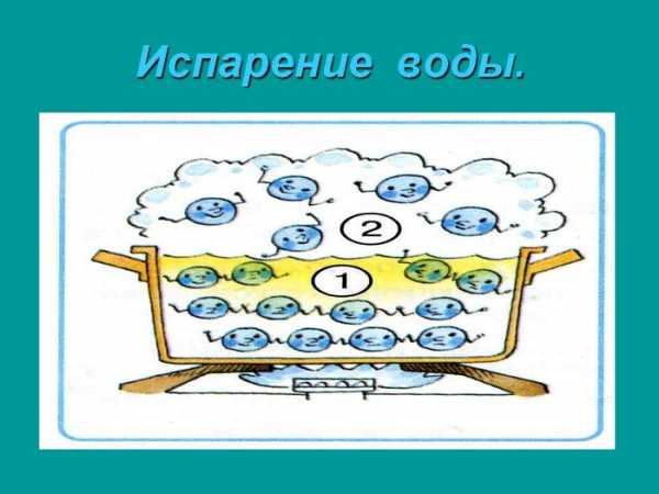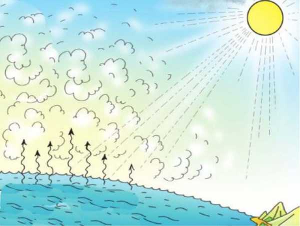 Нагревание воды в природе, и дальнейшее ее испарение от солнца схематично.