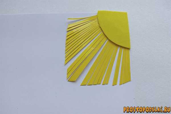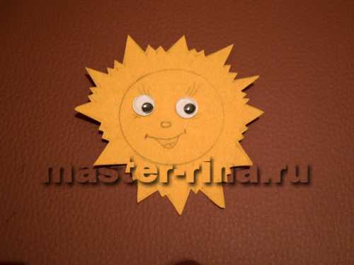 3. Из бархатной бумаги вырезать солнышко и приклеить или нарисовать ему глазки. (или можно просто солнышко нарисовать на основной картинке).