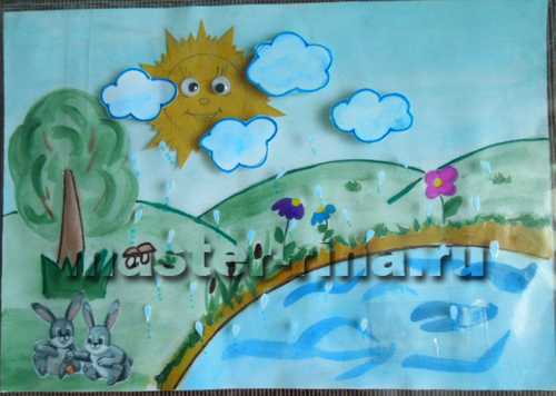 4. Основную картинку ламинируем ,приклеиваем солнышко. Вырезаем тучу, облака, капельки.
