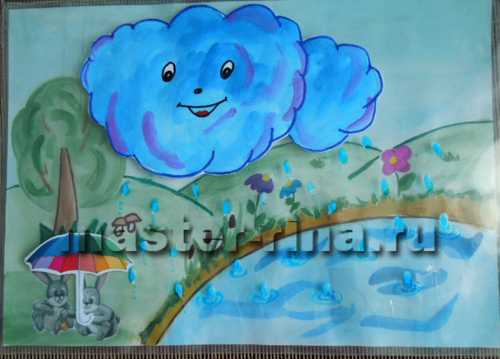 Аппликация экологической тематики, наглядно показывающая круговорот воды в природе – это интересная развивающая поделка для детей. Вы можете использовать лишь набор цветной бумаги и картона, ножницы и клей, а также ручку, чтобы показать детям, как происходит преобразование жидкой воды в пар, а затем опять в жидкое состояние. Подобные уроки – это незаменимый вариант для обучения малышей основным премудростям естественных наук, ведь они должны знать, какие процессы происходят вокруг. Конечно, информацию нужно подавать в простой и доступной игровой форме.