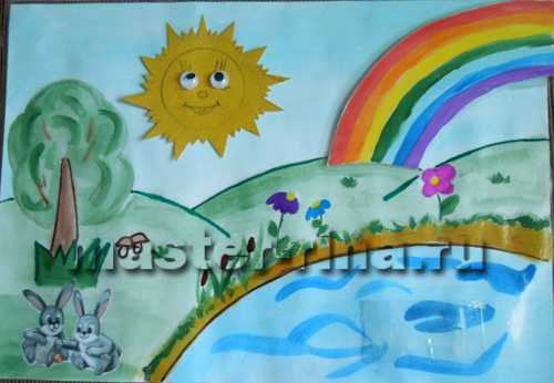 Радугу надо рисовать с учетом ее местонахождения на будущей картине, чтобы она совпала с краем неба и земли.