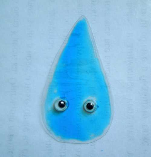 12. Отдельно на небольшой прозрачной пленке нарисовать капельку витражными красками или вырезать капельку из синего картона и заламинировать. У капельки тоже сделать глазки.