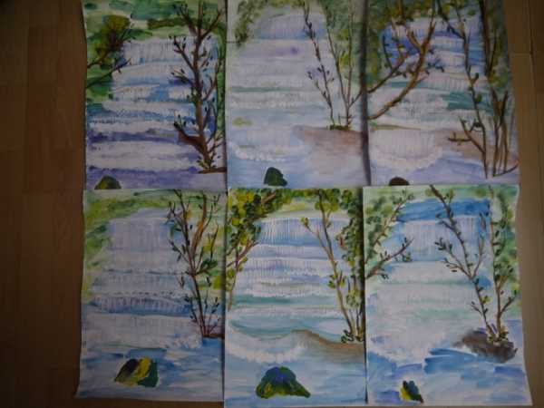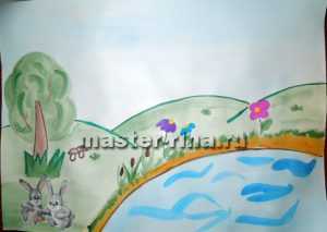 1. Нарисовать гуашью картинку (формат А4), на которой изображены вода, земля, дерево и небо. Это основная картинка. (в наборе для печати несколько вариантов основной картинки)
