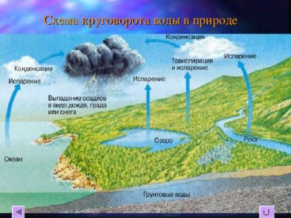 Таким образом, круговорот воды – это процесс, в результате которого вода изменяет состояние, очищается, насыщается новыми веществами. Круговорот позволяет функционировать всем формам жизни. Из-за того, что вода постоянно пребывает в движении, она охватывает всю поверхность планеты.