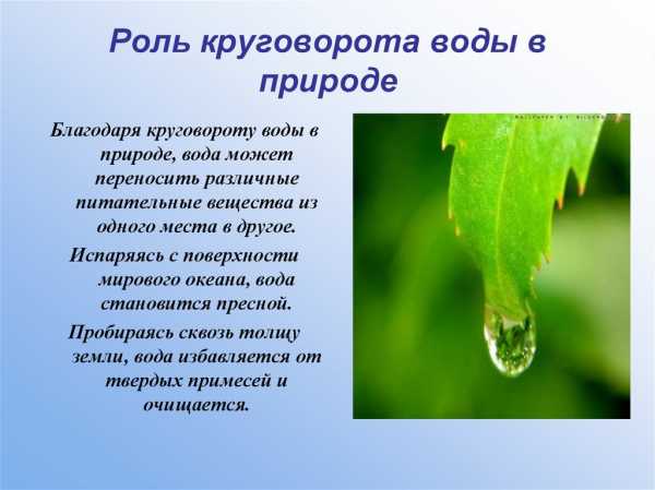 Значение круговорота воды в природе очень велико, так как благодаря данному процессу происходит взаимосвязь и полноценное функционирование атмосферы, гидросферы, биосферы и литосферы. Вода – источник жизни, дающий всему живому шанс на существование. Она переносит важнейшие элементы по всей Земле и обеспечивает полноценную жизнедеятельность всем организмам.