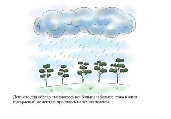 Продолжайте рисовать стрелочки, показывая, как преобразуется облако, и отпустите последнюю вниз на землю. Ниже черной тучи наклейте маленькие голубые капельки, которые падают на землю. Таким образом, вы изобразите наглядно круговорот воды в природе.