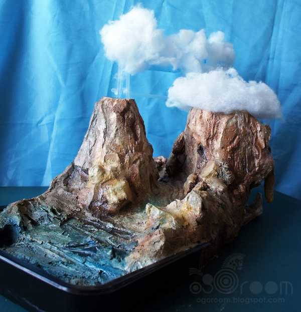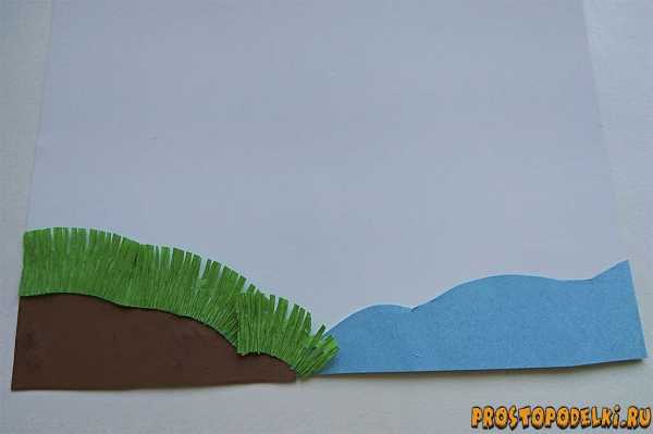 Коричневый бугорок покройте зеленой травой. Для его создания используйте зеленую гофрированную бумагу или обычный лист. Вырежьте полоску и нарежьте ее бахромой. Наклейте сверху, показывая травяной покров.