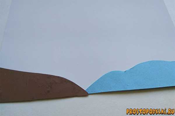 В противоположный левый нижний угол наклейте коричневую бумагу, также срезав верхнюю часть полудугой. Эта сторона позволит сымитировать сушу, которую орошает дождик.