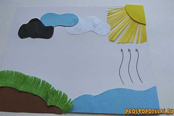 В верхнем правом углу можно показать солнце, которое освещает землю, и за счет этого происходит испарение воды. Наклейте в углу деталь из фоамирана (или обычного картона желтого цвета), а лучики сделайте из бумаги, надрезая их ножницами.