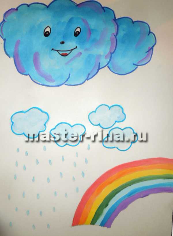 2. На другом листе нарисовать облака, радугу, тучки и капельки светлые (это пар, дождевые капельки можно нарисовать витражными красками).